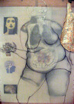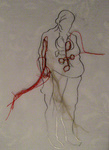 2009Er wordt tegenwoordig zo veel geknipt en geplakt in het menselijk lichaam, dit transparante werk toont een oudere dame in ijle potloodlijnen. Haar ingewanden zijn als een rode draad en zijn ook werkelijk met de naaimachine op het calqueer papier gestikt. Het werk is bevestigd op een stuk ouderwets bloemenbehang lichtblauw dat door het papier heen schemert.